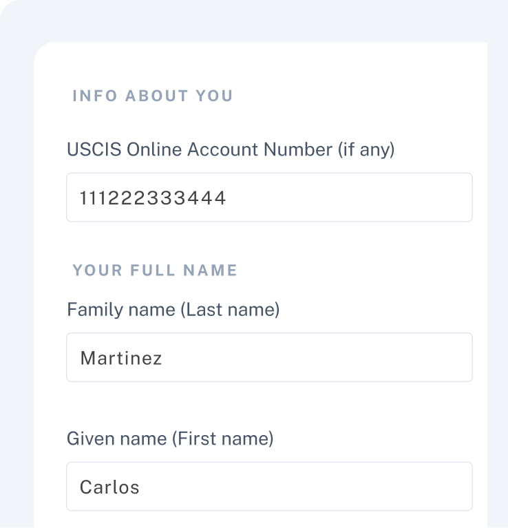 Share a simple link. No login, no portal, no instructions required. Clients fill the USCIS form quickly